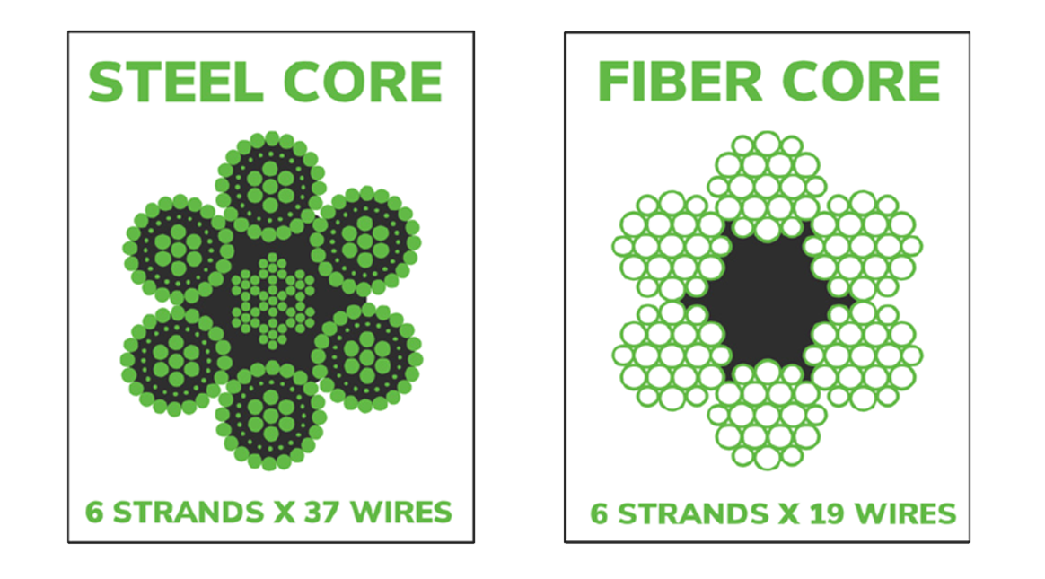 STEEL CORE: an independent wire rope core (IWRC) adds strength (7&1/2% min) and provides a greater resistance to crushing than fiber core wire rope. Wire rope is normally constructed of strands and wires.